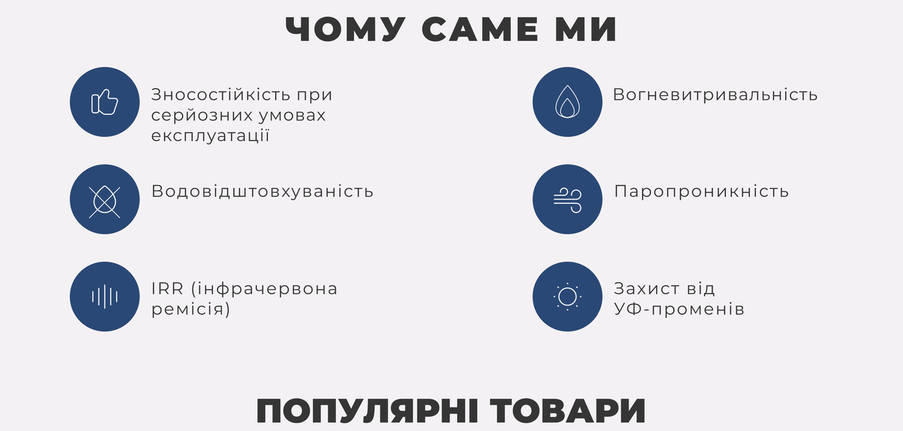 Для матерії характерна зерниста фактура. Також для цього різновиду характерна висока міцність, стійкість до стирання і розривів. Відмінною особливістю матеріалу є стійкість до води і захист від вітру. Саме тому купити тканину для пошиття військової форми буде актуально для виготовлення військового обмундирування і навіть взуття.